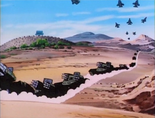 In the desert, hundreds of tanks and missile launcher role through the sand while jets fly overhead.