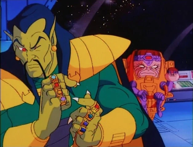 Inside the craft, MODOK and Mandarin look over the space at the satellites. Mandarin lifts his hand and fires a beam from one of his rings.