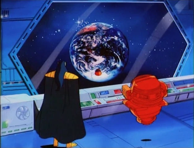 The two villains watch the miniature creature fly towards Earth. Mandarin says he has done well and MODOK says of course he has.