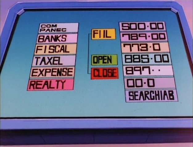 The display activates showing various records and Rhodey sits down at the desk.