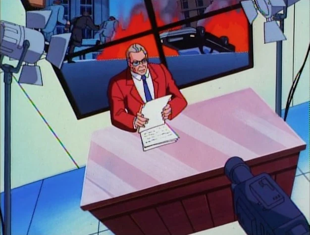 Later, Justin is sitting smiling while the anchorman explains this is a paid announcement from concerned citizen and industrialist Justin R. Hammer. The anchorman gives the floor to Justin.