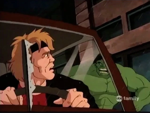 The driver of the car looks around. Suddenly, Hulk runs up alongside them and roars. He smashes the side of the car sending it flying. It comes to a halt on the side of the road.