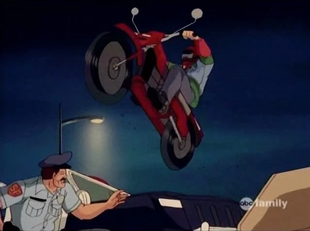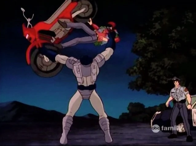 He looks down to see a huge armored man holding his bike above his head. The man pulls him off the bike, tossing the vehicle aside, asking if he wandered off the bike path.