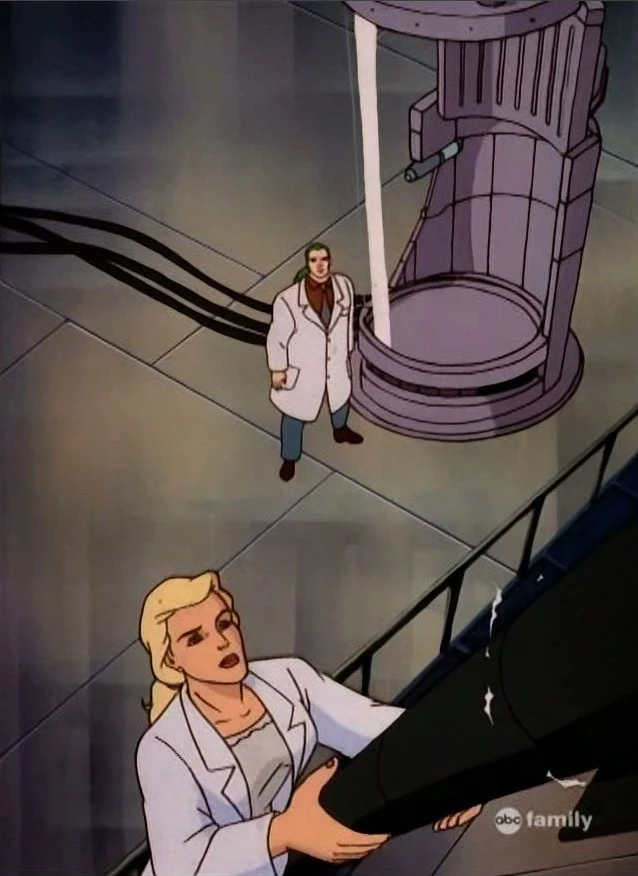 Inside, Doc Samson carries a large glass tube forward. He sets it in a machine saying that the Nutrient Bath cylinder is in place. He looks up and sees Betty hooking up a tube. She says it is online.