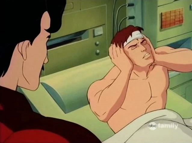 Back at Stark Enterprises, Bruce lays on a bed in an infirmary. A bandage is wrapped around his head.