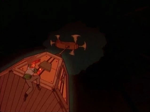 Samson watches his mug of coffee shake and spill over the side. He races up noting it's a power overload. He races out, and liquid begins gushing out of the cylinder behind him.