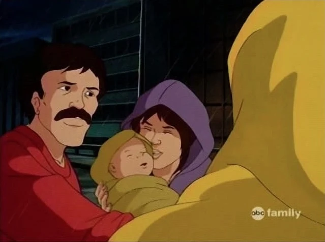The man catches up to him and stops Hulk. Hulk turns and the man takes off his raincoat and puts it on his head. Hulk smiles and looks down at the baby as it is hugged by its mother. She holds the baby up and the child feels his face. She then reaches up and kisses his cheek.