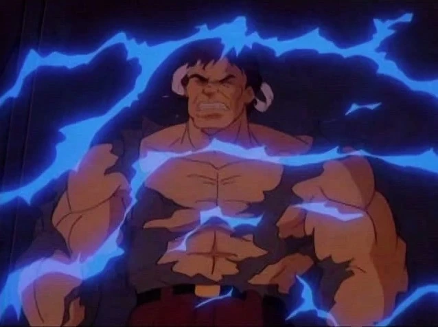 Just then, lightning strikes and Hulk falls to the ground in pain. Veins pop up in his hand moving up his arm. Steam rises off his body. The veins move up his back.