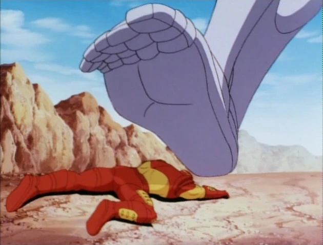 MODOK tells Ultimo to crush Iron Man like a grape. Ultimo lifts its foot and brings it down. Just before it crushes him, Mandarin orders it to stop.