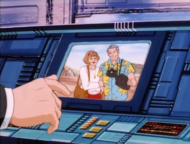 Tony turns on a monitor and it shows an elderly couple, the man holding a camcorder and camera. The man says it was an exciting adventure and they got it on their video camera.