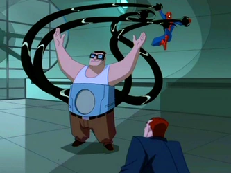 A few days later, Octavius conveys to his boss his concerns that Spider-Man may track Sandman and Rhino back to OsCorp, and particularly to himself. Osborn starts berating and belittling the overly timid and shy doctor, who pictures himself standing up to his verbally abusive employer. However, he doesn't have the nerve to act on his desire. Osborn orders him to keep running his experiments and "like a good 'Doctor Octopus.'" Octavius timidly asks him not to call him that. After Osborn leaves, Octavius resumes his work. He takes the safety key off and steps inside the experimentation chamber. While he is adjusting some machine with his mechanical arms, a shadowy figure approaches the console and puts the safety key back on and activates the generator. Octavius cries for help, claiming he had been compliant. The radiation fuses his mechanical arms with his spinal column as he yells in anguish.