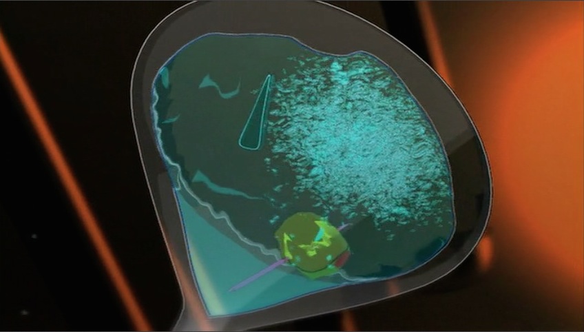 In the episode "The Party", the close-up shot of the olive entering the martini started what the producers called the "Martini Shot." In order to make transitions more interesting, they wanted to do this shot and trick audiences into thinking it was meteor that would slowly reveal itself to be an olive. They then decided that every episode should have some kind of interesting transition like that, which usually became the most difficult shot. Most are usually one shape that transforms into something else similar or the background around a character changing. Another example is the transition between when Doug is driving the limo and putting condiments on his hot dog. For the actual martini shot, there were twenty-three layers in order to get the movement of the liquid. A bug forced the glass to be split into two layers, though technology since could allow for a similar shot with a one-layered glass. It only lasts ten seconds. It is one of the most complex shots Mainframe ever did up to that point.